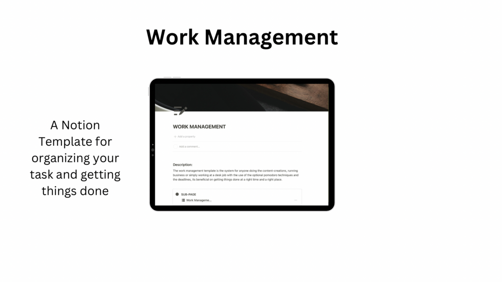 The work management template is the system for anyone doing the content-creations, running business or simply working at a desk job with the use of the optional pomodoro techniques and the deadlines, its beneficial on getting things done at a right time and a right place.